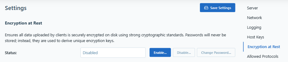 To enable encryption at rest, navigate to the Settings tab and scroll down. Click the Enable... button. Note that the server cannot be running while encryption is enabled so any active connections will be disconnected.
