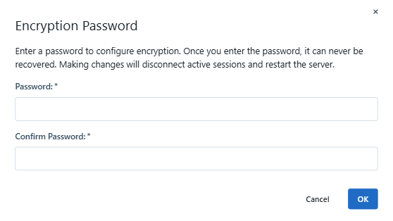 The application will then prompt for an encryption password which will be used to derive encryption keys. The password itself will not be saved and cannot be recovered if it is lost or misplaced.